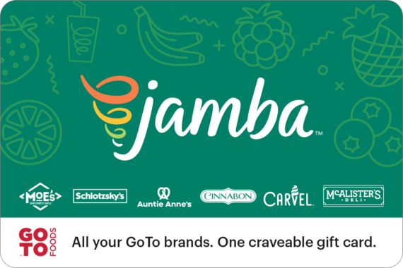 Jamba is a lifestyle brand leader serving on-the-go freshly blended fruit and vegetable smoothies, made-to-order bowls, fresh-squeezed juices and shots, boosts and bites. This Jamba Gift Card is also redeemable at participating Auntie Anne’s, Carvel, Cinnabon, McAlister’s Deli, Moe’s Southwest Grill and Schlotzsky’s locations.