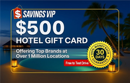 Activate & Save – Enter your code at SavingsVIP.com and unlock $500 in hotel savings at 1,000,000+ hotels & resorts worldwide, including top brands like Hyatt, Wyndham, Sheraton, Omni, and more.